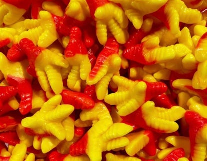 ingrediënten: suiker, glucosestroop, gelatine, gemodificeerd maiszetmeel, citroenzuur, maiszetmeel, pectine, kunststoffen, palm olie, carnaubawas, bijenwas, tartrazine, allura rood